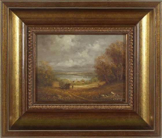 Vorgebirgslandschaft mit See, im Vordergrund ein Heuwagen