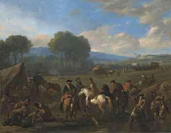 | Soldiers and horsemen resting in a military encampment, in a wooded valley | |