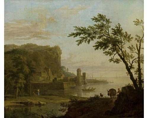 | A coastal landscape with a traveller and his horse on a path, a walled port in the distance | |