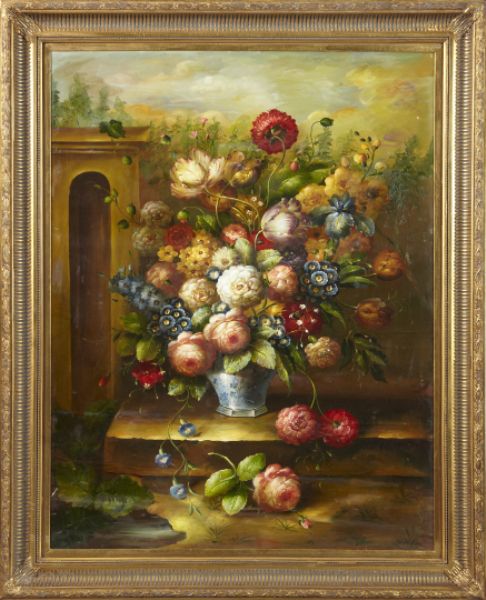 | Floral Still Life on a Stone Plinth in a Garden Landscape | |