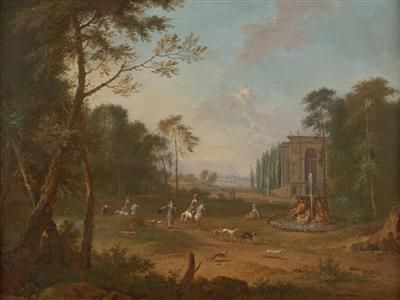| Klassische Landschaft mit Reitern und Brunnen, im Hintergrund eine Stadt | |