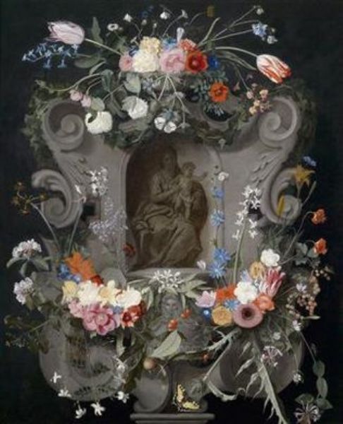 | A cartouche adorned with flowers and enclosing a relief of the Virgin and Child | |