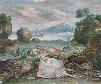 | A still life of fish on a beach, with a seal and an otter | |