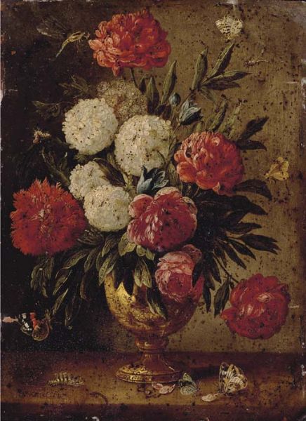 | Roses, carnations, morning-glory and other flowers with ants in a gold sculpted urn, with a caterpillar and butterflies on a woo | |