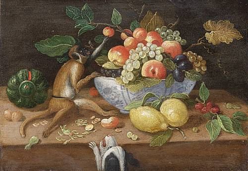 | A monkey picking fruit from a wan-li kraak bowl filled with grapes, peaches, apricots, two lemons, a melon and nuts on a table t | |