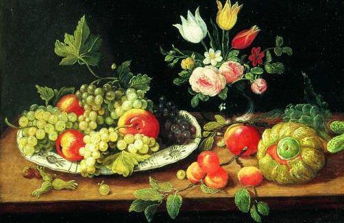| Nature morte au plat de fruits et au bouquet de fleurs sur un entablement | |