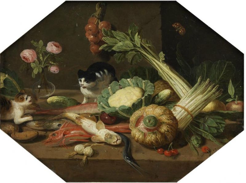 KÜCHENSTILLEBEN MIT TISCHEN UND ZWEI KATZEN