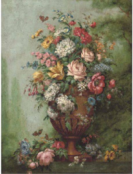 | Roses, carnations, poppies, morning glory, chrysanthemums and other flowers in a sculpted urn on a stone ledge | |