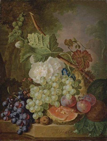 Flowers, grapes, plums, walnuts and a melon on a stone ledge