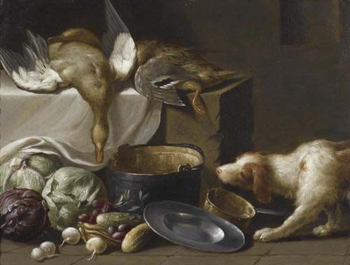 | Kitchen still life with ducks, vegetables, crockery and a dog | |