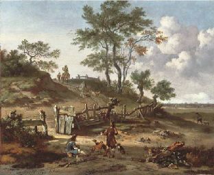 | A hilly landscape with a huntsman and a falconer resting by a gate and other huntsmen on a path | |