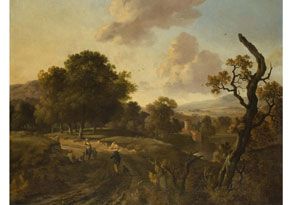 LANDSCHAFT MIT EICHENWALD, BURG UND FIGURENSTAFFAGE