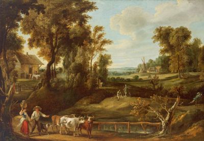 | Wooded landscape with a couple of shepherds, a dog, and three cows, | |