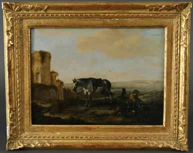 Hunter with horse and dog resting in landscape by a ruin, monogrammed JW