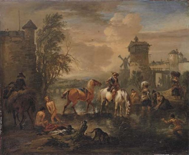 A river landscape with travellers bathing, by a village