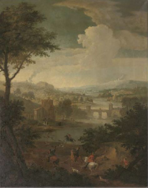 | An extensive wooded river landscape with a stag hunt, a bridge beyond | |