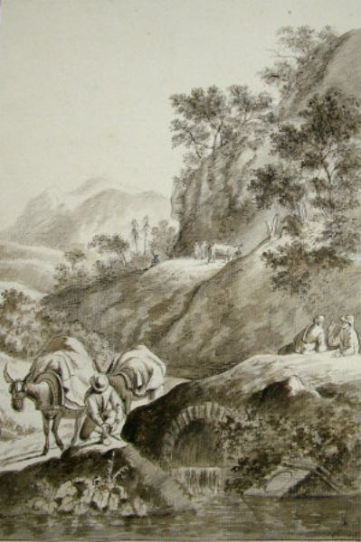 Drovers on a mountain path by a stream with woodland and mountains beyond