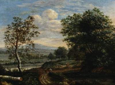 Sommerliche Flußlandschaft mit Wanderern am Waldesrand