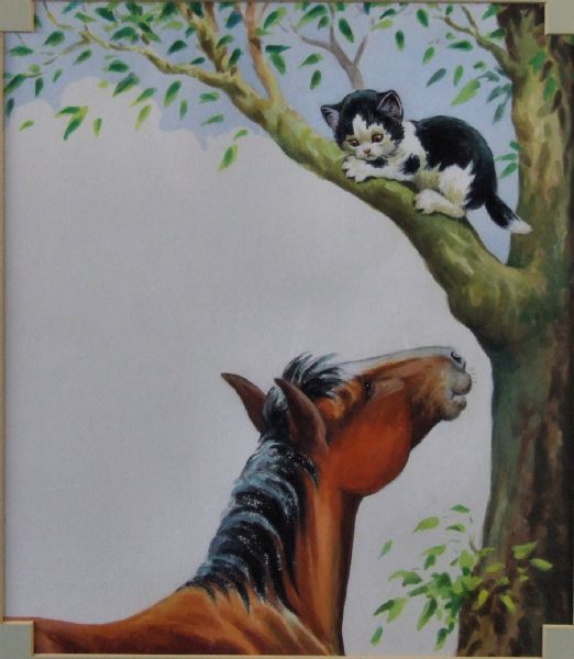 Illustration for children's book - Horse gazing at kitten in tree