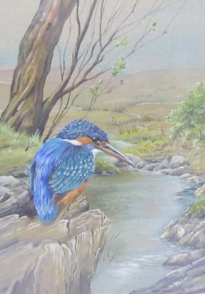 Kingfisher on a rock above a stream with distant hills