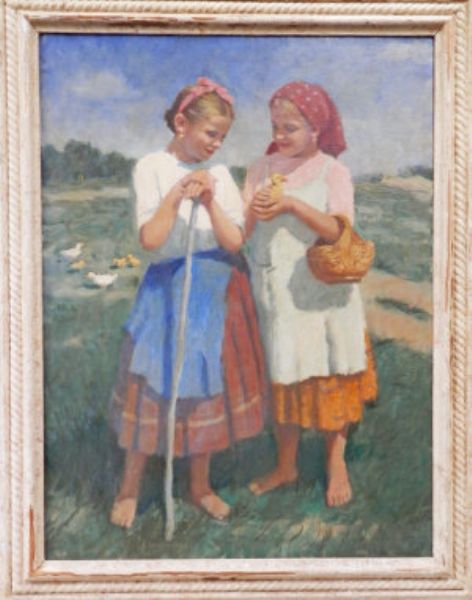 Two girls with ducklings in a landscape