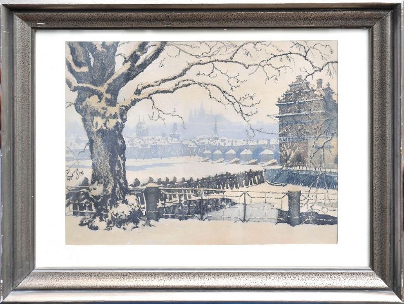 Pohled na zasněžené Hradčany z nábřeží Vltavy