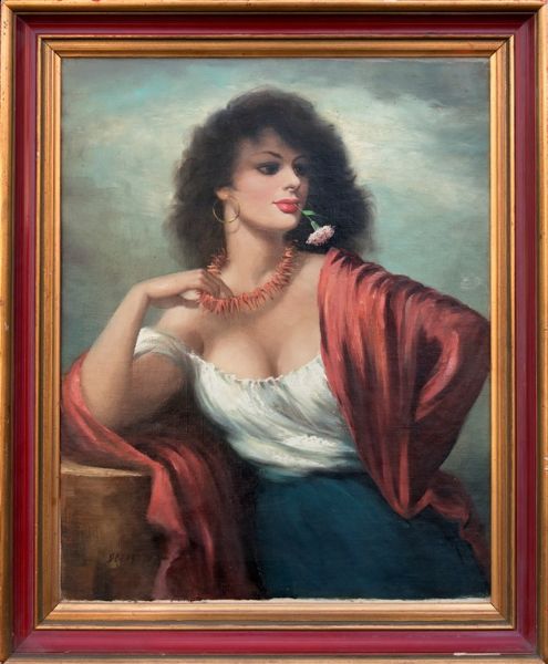 Dívka s karafiátem a náhrdelníkem z červeného korálu