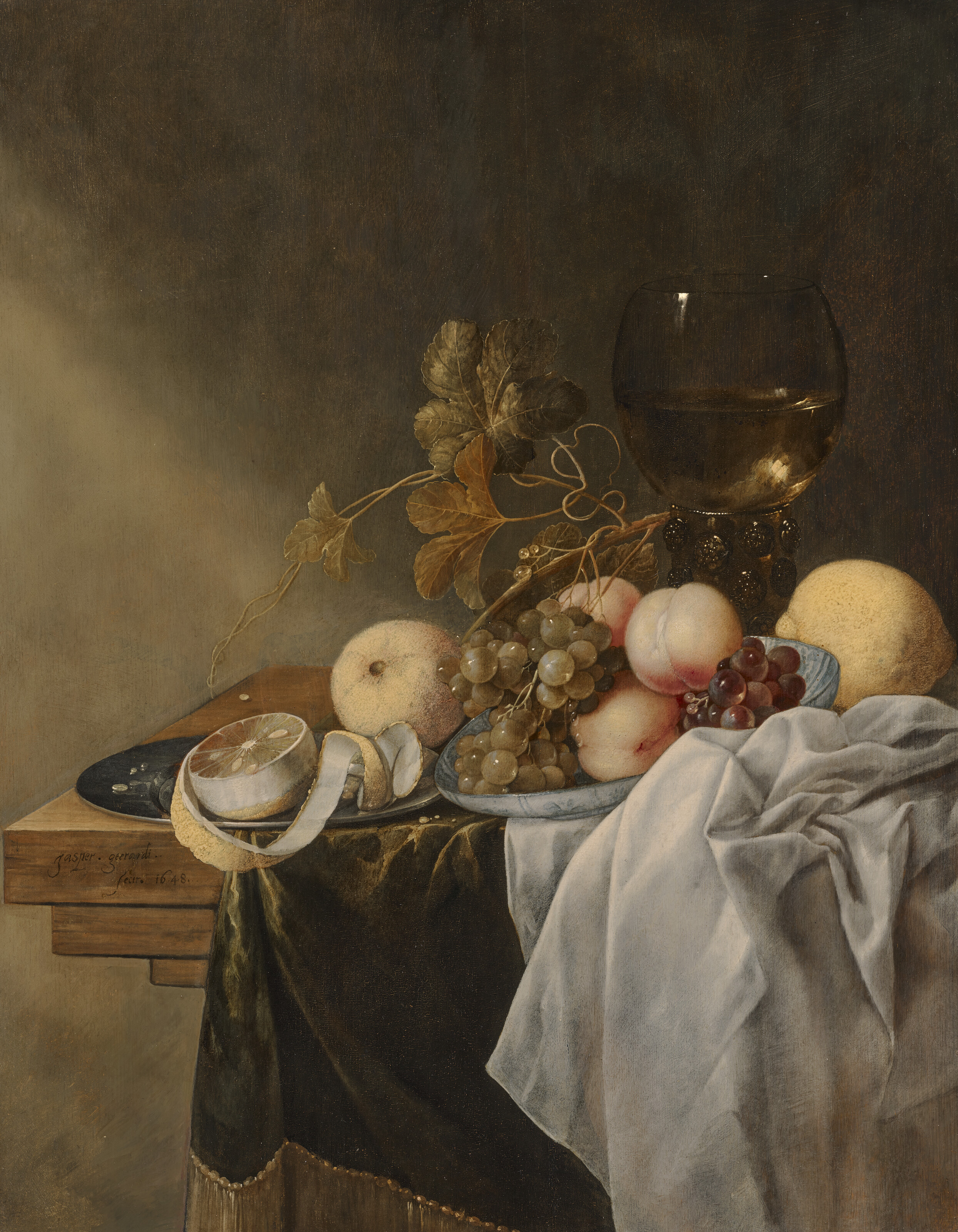 | A bowl of peaches and grapes with a roemer and a peeled lemon on a pewter plate on a draped table | |