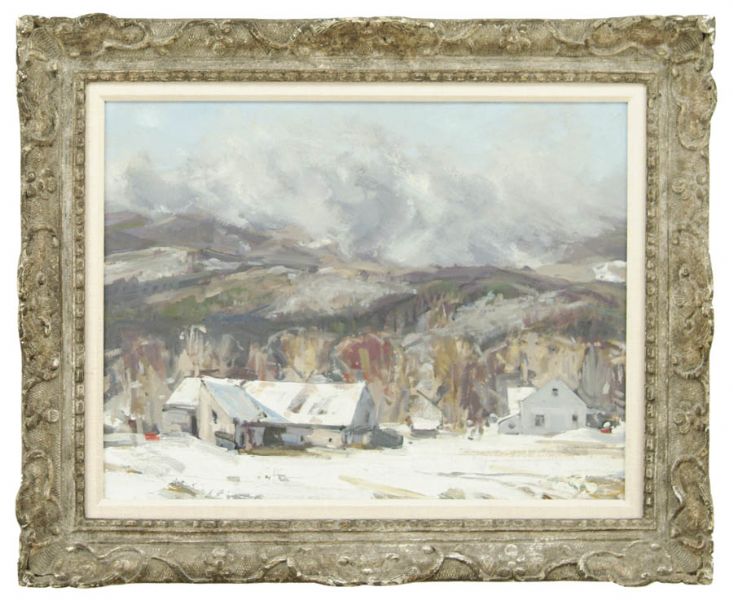 | Oil Outstanding oil on masonite landscape scene with a New England farmhouse and barns below hills and mountains that have snow squall atop. | |