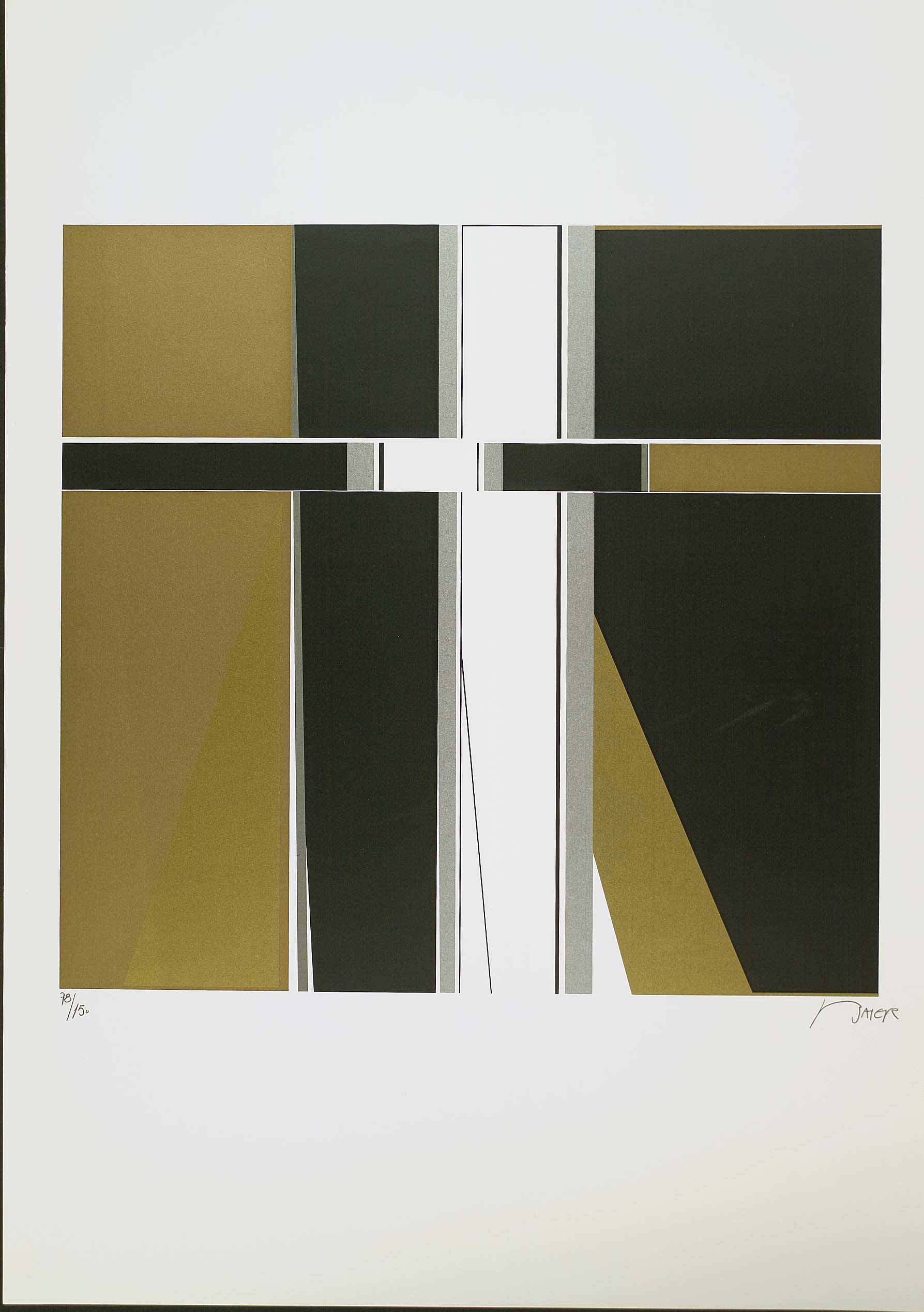 Geometrische Komposition mit Schwarz, Grau, Bronze u. Gold.