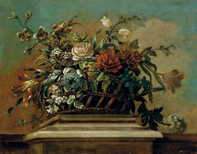 | Roses, tulips and other flowers in a basket on a ledge | |