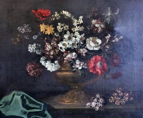 | Still life - Urn of mixed flowers on a stone ledge | |