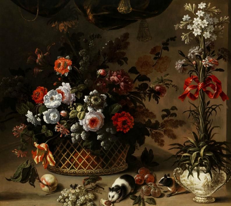 GROSSES BLUMENSTILLEBEN MIT MEERSCHWEINCHEN