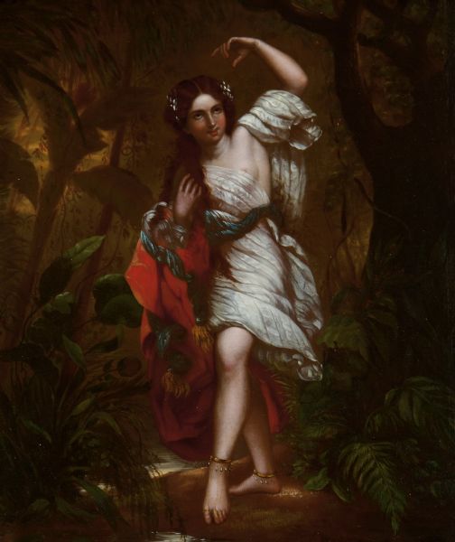 | Detailreiche Ausführung einer Quellnymphe inmitten einer baumbewaldeten Landschaft mit Flusslauf. | |