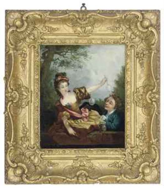 | An elegant couple blowing bubbles; and Two elegant ladies with small birds | |