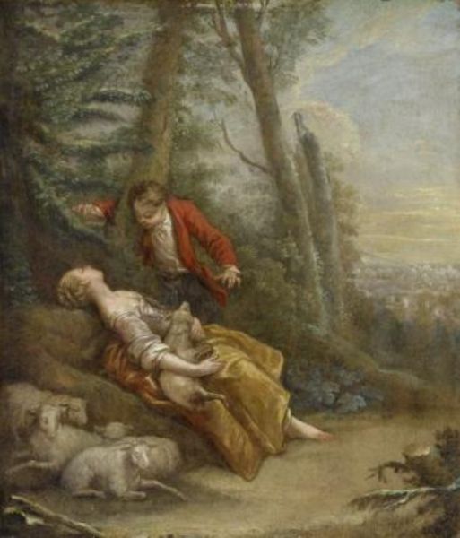 A young man discovering a sleeping shepherdess.