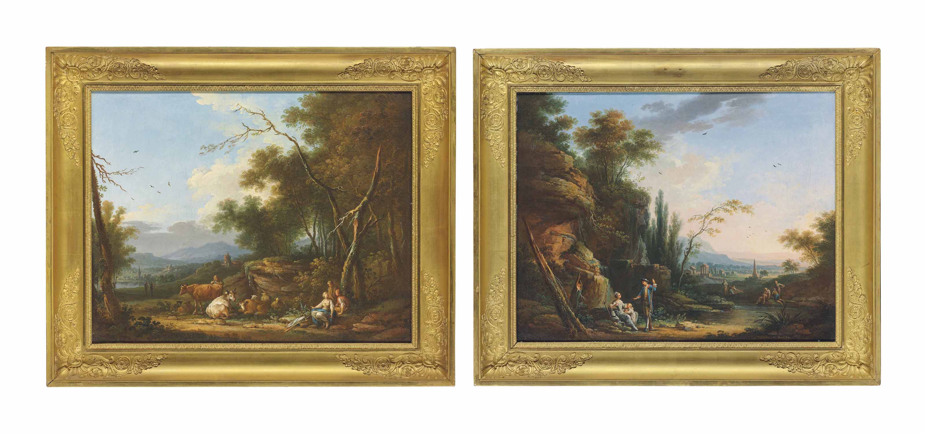 A landscape with figures resting by a rocky pool, classical ruins beyond; and A landscape with figures and cattle on a wooded path | |