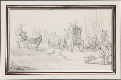 A coach and six passing a fishing village. Signed and dated Le Prince 1760. Black chalk and wash on paper. Sheet size 180×304 mm. | |