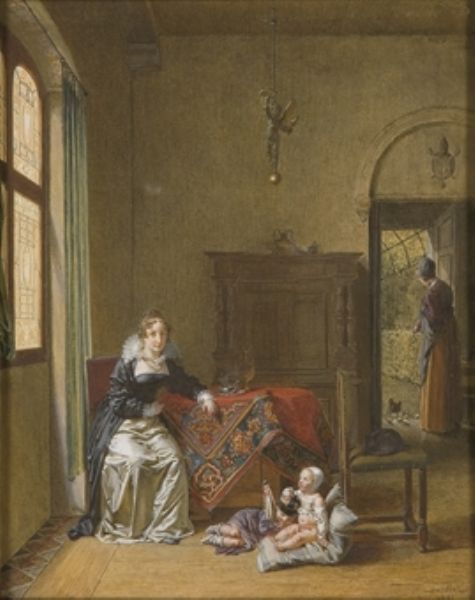 | Une femme assise dans un intérieur hollandais surveillant ses enfants, une gouvernante à l'arrière-plan | |