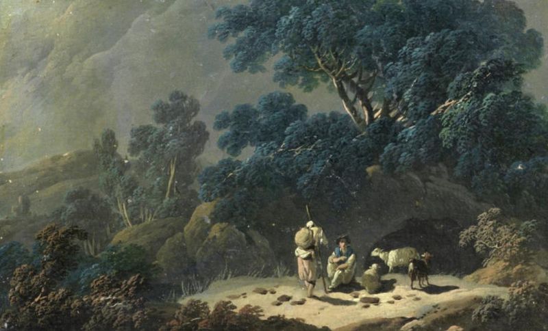 | A landscape with shepherds and sheep resting in a woodland clearing | |