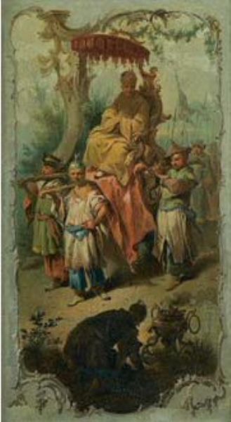 | Mandarin transporté en chaise à porteurs dans un encadrement d'arabesques | |