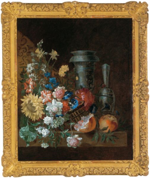 | A basket with carnations, vetch, peonies, and a sunflower, two magnificent blue and white vessels | |