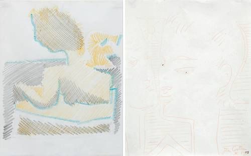 | Crayon pencil and ink on paper; second color pencil and graphite on paper | |