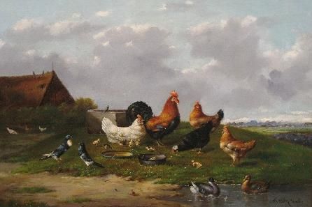 farm scene with chickens and other birds by a water trough, a building behind