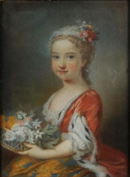 | Felicite Anne Josephe de Battines, a portrait of the young girl, three-quarter length seated, holding a basket of flowers | |