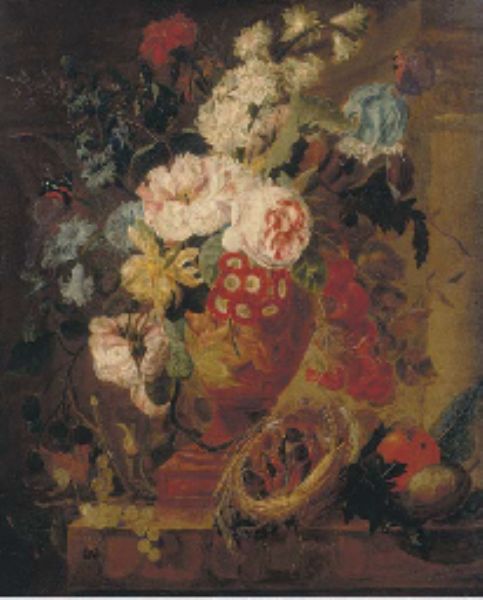 | Flowers in a terracotta vase decorated with putti, with fruits, butterflies, a bluebottle, a snail, a spider and four chicks in | |