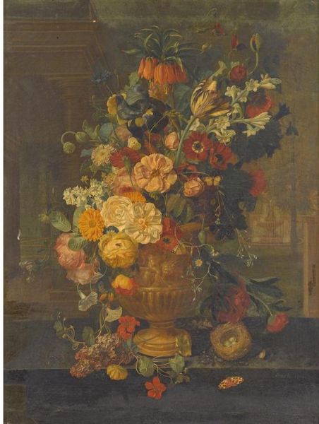 | STILL LIFE OF MIXED FLOWERS IN AN URN WITH BIRDS NEST, MOUSE, AND BUTTERFLY ON A LEDGE | |