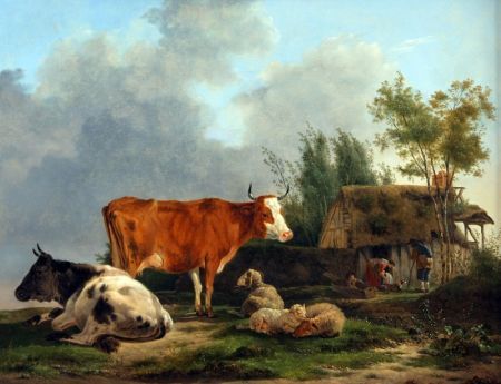 | Rustic Landscape with Cattle and Sheep in Foreground, Family by Cottage Behind | |