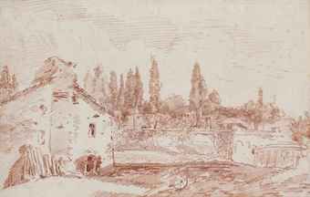 | A landscape with a cottage, a wheel barrel in the foreground | |