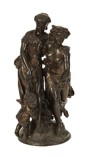 A bronze figural group of two maidens and a putto